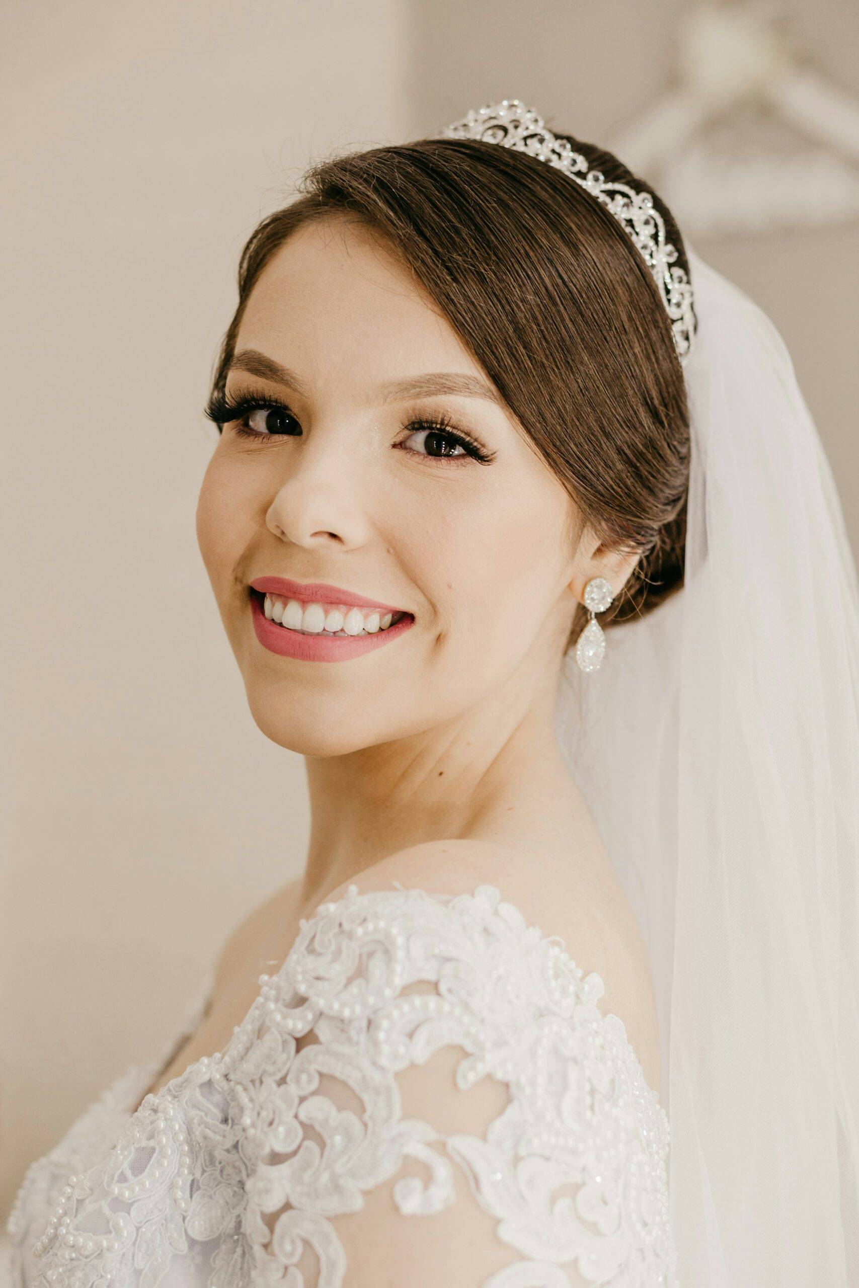 Wahida did an amazing job with my bridal makeup. I felt like a true jewel on my special day! The makeup was flawless and lasted all night. The image shows Aisha in her wedding dress, smiling radiantly with perfectly applied makeup.